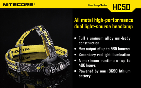 HC50 is constructed from aero-grade aluminum alloy and has higher strength and better cooling performance than plastic products. Its HA III rugged anodized hard surface provides head protection effectively. HC50 is also highly waterproof (two-meters submersible) and shatter resistant. With two-stage switches and five brightness levels, it provides up to 400 hours runtime at 1lm output.