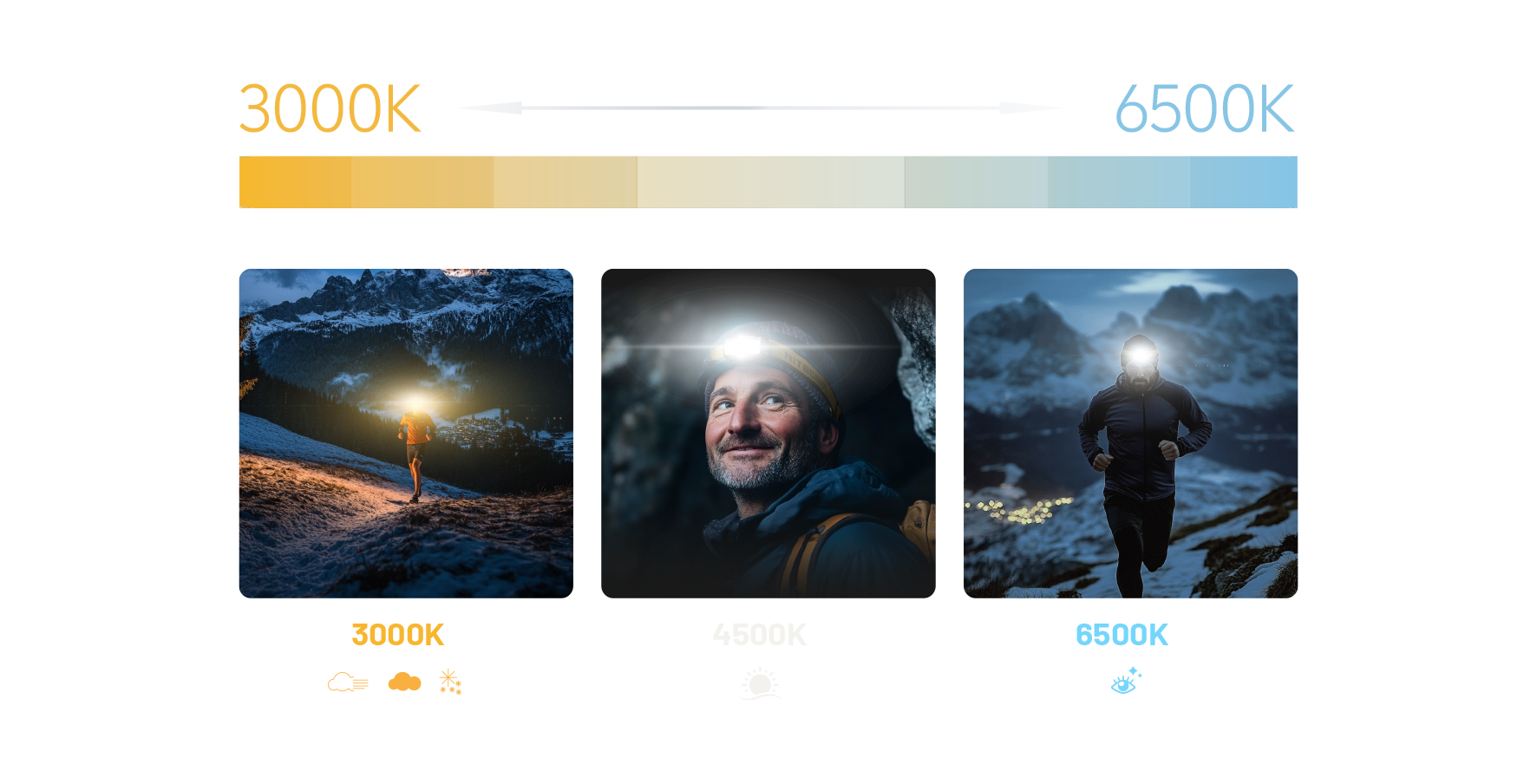 • 6500K Cool White Light resembles the noonday sunlight and helps you be wakeful and attentive during long hikes or runs.